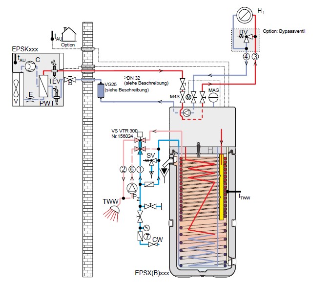 Das Vorschaltgefäß dient hier nicht zum Temperaturschutz von MAGs, sondern lediglich zur Vergrößerung des vorhandenen Wasservolumens. Damit soll sichergestellt werden, dass *immer* ausreichend viel warmes Wasser (und damit thermische Energie) vorhanden ist, um einen störungsfreien Abtaubetrieb (Kältekreisumkehr) zu gewährleisten.