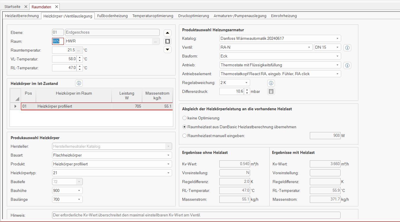 Mit VL von 58°C und RL von 55,9°C kommt halt ein riesiger Massenstrom raus, um die Heizlast von 908 Watt zu erzeugen. Da würde ich mich als Ventil auch beschweren. Wahrscheinlich gehts du nicht so vor, wie es sich die Programmierer gedacht haben. Im Reiter Temperaturoptimierung kannst du " Brennwertkessel (Gas)" anwählen. Dann habe ich die Rücklauftemperatur auf 55 und Spreizung auf 15K gesetzt, und "maximale Optimierung" gewählt. Damit kommt der HWR auf 1,006, VL auf 67 und RL auf 52 für alle Räume. Damit kommt dann ein vernünftiger Massenstrom von 51 kg/h raus, und kv ist auch im grünen Breich. Im Reiter Druckoptimierung habe ich den Punkt "Zone/Strang mit Differenzdruckregler/drehzahlgeregekter Pumpe im Bestand" gewählt. Dann erhalten alle Ventile 50 mbar Druckdifferenz. Das hat aber nur Auswirkung auf die Voreinstellung, nicht auf den Massenstrom. Bei den Heizunsgarmaturen kannst du als Antrieb "Elektronische Thermostate" wählen. damit wird es etwas günstiger für das Ventil.