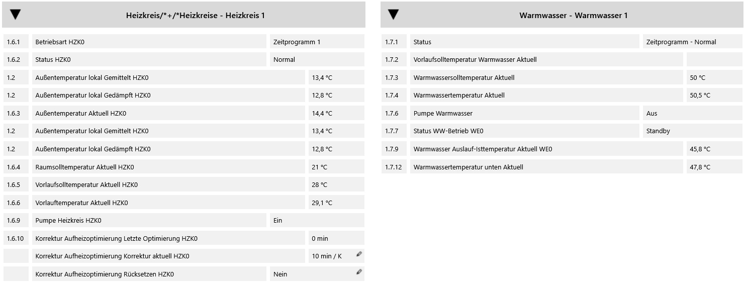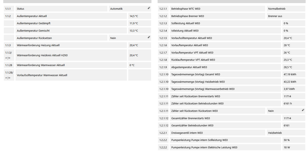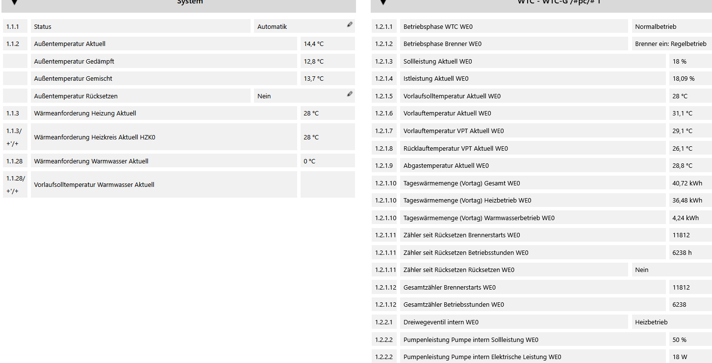 Zitat von fiete  Das ist doch schon ein guter Wert (ca. 3 kW)! Unsere (fremdgesteuerte) WTC-G(W) 15 kommt nicht unter 28 % (ca. 4,2 kW). Ich werde mal der Techiker, der diese Woche zur Wartung kommt, dazu befragen.[...] Das wäre sehr nett von Dir da etwas in Erfagrung zu bringen. Mir wurde damals gesagt wir hätten ein Überströmventil, wo sitzt das eigentlich? Oben neben dem Abgasrohr? Jetzt reiche ich erstmal meine aktuellen Einstellungen nach. |