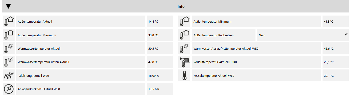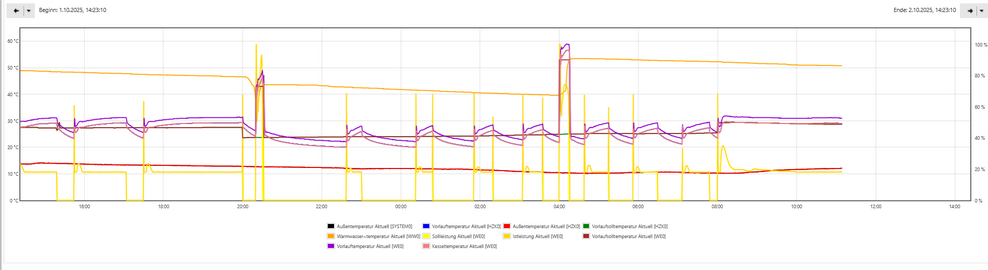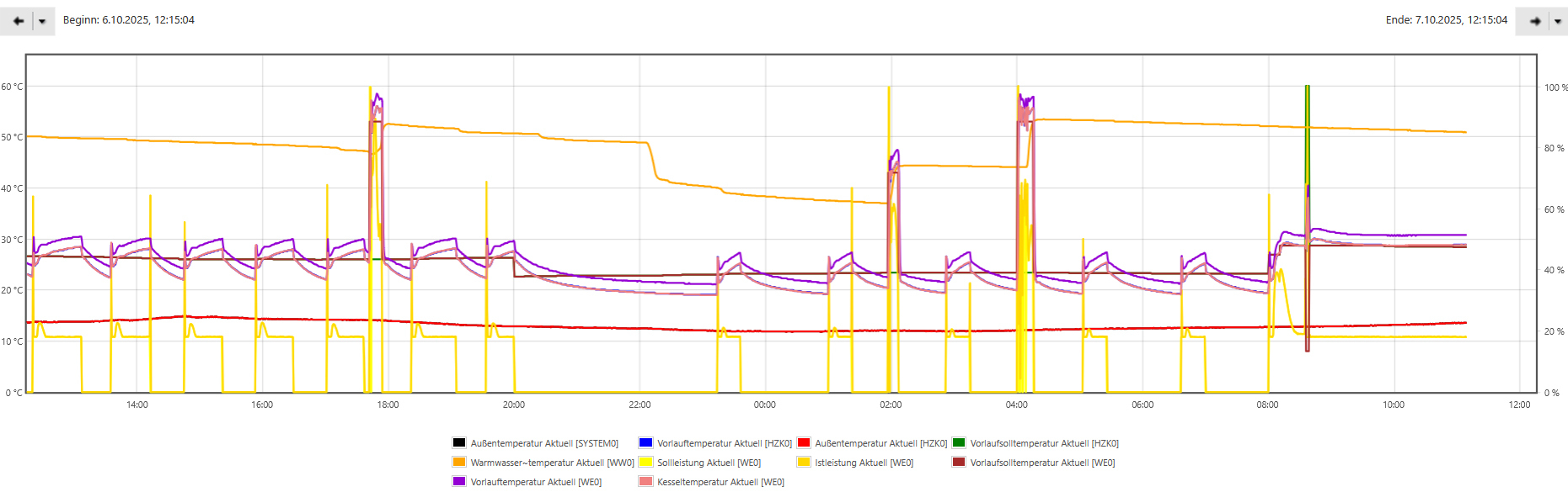 Moin, mich irritiert noch die Zwischenladung gegen 02:00 Uhr..... Gibt es einen grund das Du das WW bereits gegen 04: auf volle Temperatur bringst? wie es aussieht schaftt dein Heizgerät durchaus einen Temperaturhub von ca. 7°C innerhalb einer viertel bis halben Stunde. Je nachdem wie dein Haus gedämmt ist könnte sich auch eine Nachtabschaltung ( ggf. mit Comfortverlust) von 23:00 bis zum "wecken" -30 Minuten positiv auf Verbrauch un d Starts auswirken. Auch das dreiwegeventil könnte u.U. nicht mehr 100% dicht sein. In der Nacht sind leichte Temperaturschwankungen zeitglich zu den Heizstarts sichtbar, nicht das der WW-speicher die Heizung unfreiwillig unterstützt. Aber hier sind m.M.n. keine riesigen Ergebnisse mehr abzuholen. Hast Du noch Bilder von den Heizkörpern, den RTL und ggf. dem Überströmventil? Grüßle