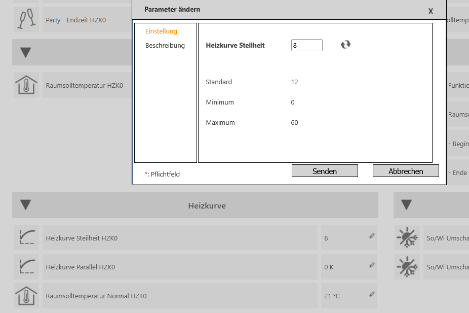 Zitat von DMS20  Wenn "Steilheit HZK0 9" heißen sollte, dass eine Steigung von 0,9 wirkt, ist es erst'mal gut. Wenn es allerdings eine "9" sein sollte, ist es viel zu steil. Steilheit lässt sich bei Weishaupt zw. 1 und 20 (oder größer) einstellen. Entspricht dann wohl bei anderen Herstellern 0,1 - 2,0.