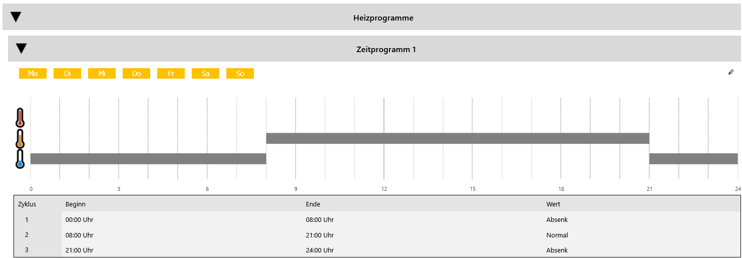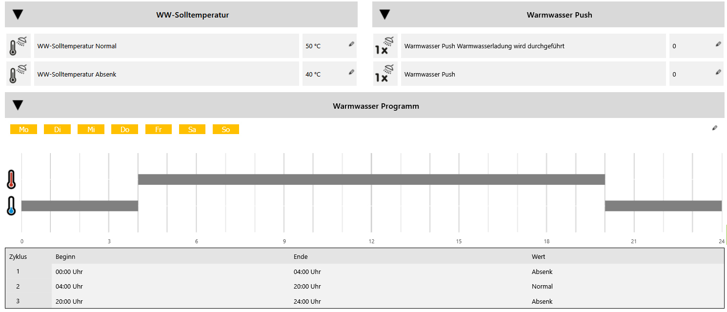 Guten Morgen Ihr fleissigen Helferlein, Der Techniker vom Heizungsbauer hatte die Warmwasserbereitung den ganzen Tag auf 50 Grad eingestellt. Ich hatte dies im Nachhinein beschränkt, weil ich meist gegen 04:30 aufstehe. Nach dem Einbau der Heizung hatten wir nämlich die WW-Erwärmung nur von 18:00 bis 22:00 aktiviert. Der Heizungsbauer meinte dann aber, das das Murks ist und den Tag über an sein soll. Was ist nun besser? Ich gehe morgens aus dem Haus und komme Abends wieder. Die Nachtabsenkung von 21 Grad auf 18 Grad habe ich so eingestellt: Einige sagen auch, dass eine Absenkung nicht viel Sinn macht. Ist das ein Überstromventil? Die schwarze Drehkappe ist geschlosen. Der aktuelle Datenlogger darf natürlich nicht fehlen ;-) LG Sandra