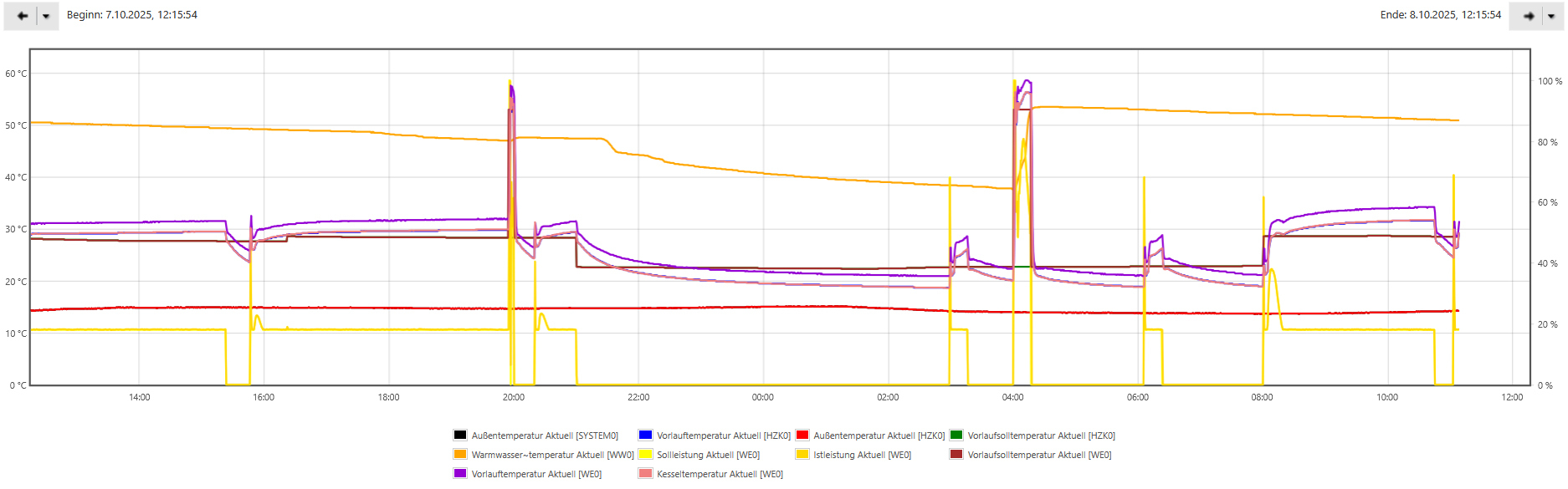 Das liegt wohl an dem WW-Heizprogramm ("auf 40 °C abgesenkter Betrieb in den Nachtstunden"). Zitat von JoergW  Gibt es einen grund das Du das WW bereits gegen 04: auf volle Temperatur bringst? wie es aussieht schaftt dein Heizgerät durchaus einen Temperaturhub von ca. 7°C innerhalb einer viertel bis halben[...] Da sehe ich auch noch Einsparpotential. Lässt sich das WW-Heizprogarmm nicht besser an den Verbrauch bzw. Verbrauchszeiten anpassen? In dem zuletzt gezeigten T-Diagramm ist nur in den späten Abend- und frühen Nachtstunden ein WW-Verbrauch erkennbar. Und wird in den Nachtstunden wirklich WW mit ± 40°C benötigt?
