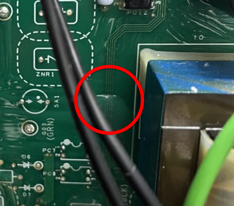 [...] Der Schutzlack war zu erkennen, aber ich meinte die kleine Stelle zwischen den unbestückten Steckplatz SA1 und den Trafo. Die ist auf dem Bild leider von den zwei schwarzen Drähten verdeckt, aber auf einem der vorherigen Bilder sieht es für mich so aus, als wäre da ein Knick.