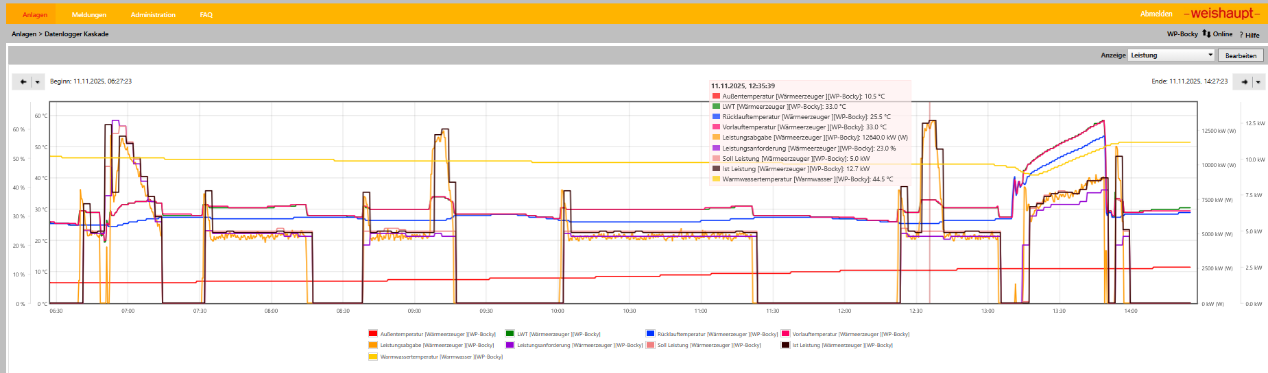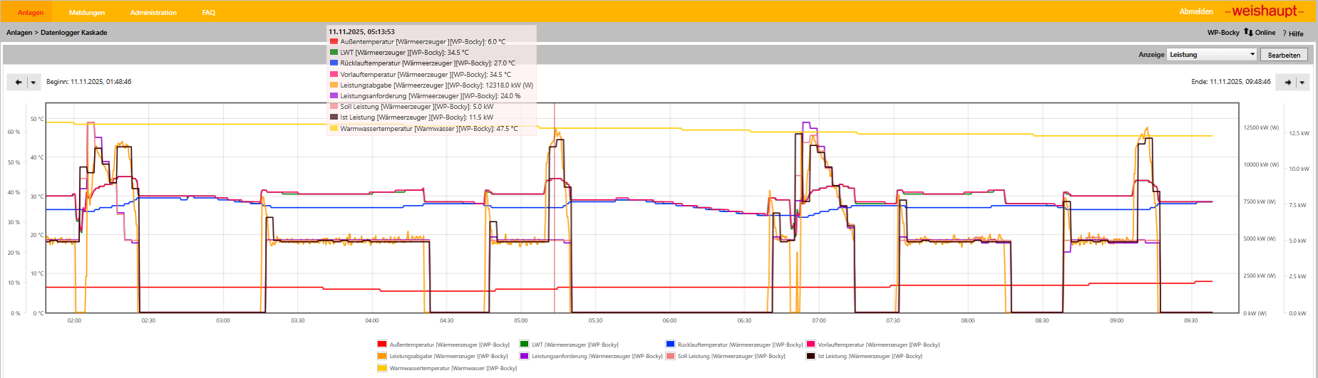 Im Angehängten Screenshot ist zu sehen das die Ist-Leistung mehr als doppelt so hoch ist wie die Soll-Leistung zum Ende des Taktes. Oder im zweiten Screenshot auch am Anfang. Ist das ein normales Verhalten? Hätte so ein Verhalten beim Abtauen erwartet. Gefühlt überschwingt die WBB ganz gerne. Um die WBB etwas zu zügeln und sie zu einem Langstreckenläufer zu bekommen wäre es eher Ratsam die FBHK Umweltzpumpe auf höchster Konstandförder Stuffe laufen zu lassen oder eher auf Mittlerer Stuffe um z.B. einen Hydraulischen Kurzschluss (Bad voll aufgedreht) zu vermeiden oder dass die Wärme eventuell besser an den Fußboden abgeben werden kann?