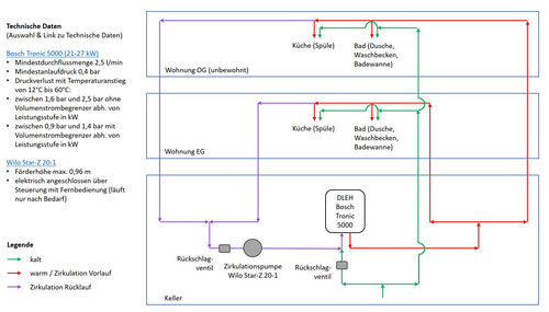 Zur besseren Übersicht habe ich das Installationsschema einschließlich der technischen Daten von Durchlauferhitzer und Zirkulationspumpe als Bild beigefügt.
