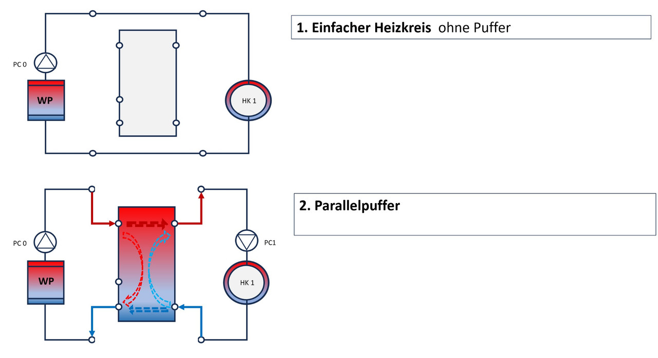 Vielen Dank für die geniale Erklärung. Jetzt ist mir auch völlig klar, warum es Wärmepumpen absolut keinen Sinn macht einen parallelen Puffer zu verbauen. Es ist einfach unmöglich beide Umwalzpumpen mit gleichem Durchsatz laufen zu lassen. Theoretisch geht das nur, wenn die Pumpe des Heizkreises ebenfalls durch die Wärmepumpe gesteuert würde. Aber da ist es eigentlich auch nur ein Reihenspeicher im Vorlauf... Schade, dass die Heizungsbauer das nicht verstehen, zumindest viele.