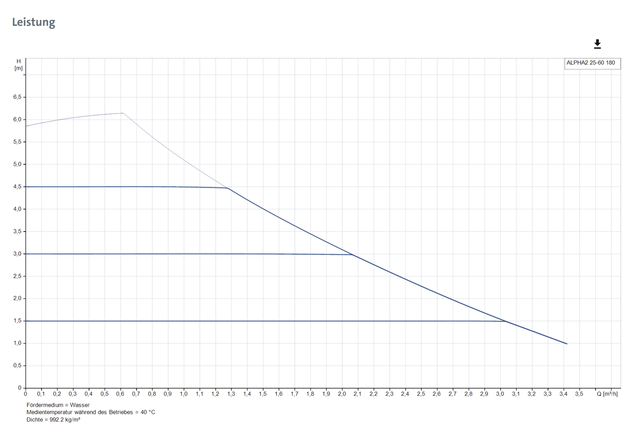 Zitat von cgnapi  Zitat von Eddi Lang  [...] Ja Pumpe ist eine "Grundfos Alpha 2 25-60 180", die 2 Heizkreisverteiler, die je getrennt über 30mm Außendurchmesser Kunststoffrohre verbunden sind versorgt. Maximaldurchfluss des Sekundärkreislaufs ist lt. Pumpe bei 1100 l/h wenn alle Heizkreise offen sind. Die Pumpe läuft[...] Ok - Dein Hauptstrang hat damit ca. 23 - 24 mm Innendurchmesser. Der schafft schon was an Durchfluss. Wie lang ist denn der Weg vom AG zum IG und von drot Wie gut passt die Sekundärpumpe zur Primärpumpe? Ich hab Dir mal das Pumpenkennlinienfeld der Primärkreispumpe einkopiert - innerhalb der fett und gestrichelt umrandeten Feldes kann die Pumpe infolge der stufenlosen Drehzahlregelung (= "PWM-Regelung") jeden Betriebspunkt annehmen. Ein Betriebspunkt ist definiert als der Punkt, wo sich die vertikale Linie des benötigten Durchflusses (X-Achse) mit der horizontalen Linie des zu überwindenden Gegendrucks des Leitungssystems auf der Y-Achse (= "Druckverlust" oder "Förderhöhe") kreuzt. Der Gegendruck des Leitungssystems kommt übrigens durch die Reibung der von der Pumpe "geschobenen" Wassermoleküle an der Rohrwand und auch miteinander zustande, denn das Wasser wird an der Rohrwand gebremst und fließt daher dort langsamer als im Rohrzentrum. Was "kann" die Primärpumpe? Beispiel: 20 L/min = 1,2 m³/h schafft sie noch durch ein Leitungssystem, das bei dieser Durchströmung einen Druckverlust von 72 kPa = 7,2 m Förderhöhe = 720 mbar erzeugt. Und auf dem vermutlich eher Kurzen Weg vom AG -> IG -> Puffer ist das für sie ein Kinderspiel. Nun zum Pumpenkennlinienfeld der Alpha2 25-60 (die "60" stehen für einen max. Druck von 60 kPa = 6m Förderhöhe = 600mbar)...bei der Einstellung "Konstantdruck" kann die Pumpe in drei Stärken fördern - das sind die waagerechten Linien. "Dazwischen" kann sie in dem Modus nicht. Der bei Kennlinie CP3 = obere Waagerechte von der Pumpe gehaltene Druck ist 4,5 m = 450 mbar. Jetzt kommt es darauf an, bei welcher Durchflussmenge der Gegendruck das Rohrsystems exakt 450 mbar entspricht. Diese Menge wird dann gefördert. Maximal sind es 1,3 m³/h = 21,6 L/min. Das ist ein Wert, bei dem die Primärpumpe noch lange nicht am Ende wäre: sie drückt diese 21,6 L/min auch noch durch ein Rohrsystem, das dabei 700 mbar Gegendruck aufbaut. Würdest Du die Pumpe auf konstante Drehzahl Stufe III stellen, gilt die oberste Kurve: da würde tatsächlich mehr als die 1.000 L/h = 16,7 L/min gefördert. Die Einstellung konstante Drehzahl III wäre für das Anheizen nach einem Abtauvorgang natürlich klasse...nur eben leider nicht nicht mehr 15 - 30 min später, wo die Primärpumpe dann wieder den Durchfluss runterregelt. Dann ballert die Alpha2 vuviel und zeiht sich eigenen Rücklauf in den Vorlauf, wodurch die VLT in den Heizkreisen reduziert wird = Weniger Heizleistung. Das ist das eigentliche Dilemma. konsequenter Lösungsansatz wäre:Puffer zum Reihenrücklaufpuffer machen (oder bei ebay verkaufen), Überströmventil einbauen - das hier wäre dann der entsprechende Hydraulikplan. Pumpengruppe mit der Alpha2 raus, sodass die viel stärkere Primärpumpe direkt in die Heizkreise fördert. Kommt das für Dich grundsätzlich infrage, müssen wir uns ein paar Gedanken zum Druckverlust des Systems machen. Ich kann das für Dich unverbindlich und daher logischerweise auch kostenfrei rechnen, wenn ich von Dir die Längen der Stränge bekomme, die ich Dir dann genauer benennen würde. Gott sei Dank sind die 2 Verteiler jeweils mit einem eigenen 30er - Rohrstrang getrennt angebunden, schreibst Du. Trennen sich deren Wege direkt hinter der Pumpengruppe? Frage1: wie lang ist der Rohrweg vom AG zum IG bis Puffer (einfache Entfernung) und welche Rohrdurchmesser und -material hat der HB diesem Weg gegönnt? Daikin schreibt DN32 = 32 mm Innendurchmesser der Rohre vor; das sind bei Kupfer bzw. Edelstahl dann 35 mm Außendurchmesser. Frage2: wie lang ist der Rohrweg ab Puffer bis zur Trennung der 2 Verteilerstränge? Frage 3: hast Du mal mit den 2 verlinkten Tools von gestern schon mal Deine Heizlast nachgerechnet? Daikins Rechner fragt nach m³ Gas/a. Das steht in Deiner Gasabrechnung. Hinweis: das 10 kW-Außengerät würde zu Deiner Inneneinheit passen. Es hat dasselbe Außengehäuse und auch Innenleben wie Deins mit 8 kW ( alles identisch, da das 8 kW eine niedrigere Drehzahlgrenze des Verdichters als das 10er hat). Gruß - Eddi PS: welche Sekundärpumpenansteuerung bei Daikin meinst Du?