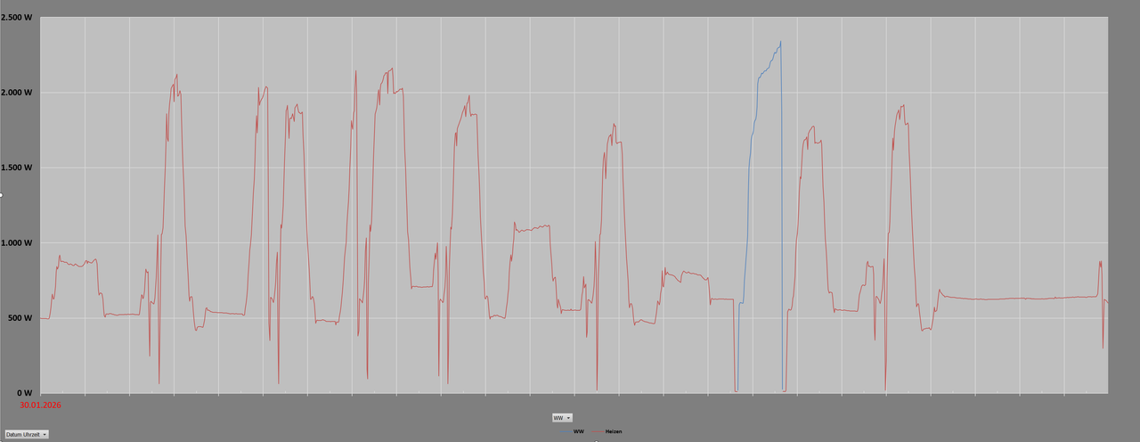 Zitat von cgnapi  Klar ist das nicht optimal, aber mein Problem ist auch nicht die Effizienz oder Veränderung der VL/RL Temperaturen durch den Speicher, sondern die mangelnde Erzeugungsleistung (vermutlich durch Unterdimensionierung) und der Heizstabeinsatz. Rückblickend hätte man wohl eine 12kw Variante und eine stärkere Umwälzpumpe am Speicher verbauen müssen (oder den Speicher ganz weglassen sollen). Hätte eben gerne gewusst, dass eine Daikin 8kw bei Temperaturen um 0 Grad wegen des Abtauens effektiv nur 5,5-6 kw im Tagesschnitt erzeugt bei mir.[...] Was Deine Heizlast angeht, so kannst Du sie "Pi x Daumen" über diesen Heizlastrechner bestimmen. Der ist ziemlich gut. Daikin hat auch einen (Excel-basiert), der auch gut ist. Kannst ja mal hier teilen, was rauskam. Wahrscheinlich bist Du "gefühlt" irgendwo zw. 8 -10 kW. Dann ist Deine Heizlast um 0°C ca. 5 kW. Nach einem Abtauen will die Regelung erstmal rasch wieder Wärme in di Hütte schieben, weshalb sie auf volle Leistung geht: bei direkt angebundenen Anlagen kann man das wunderbnar am Stromschrieb sehen. Da Deine Sekundärpumpe aber weiterhin konstant ihre Menge ins Haus tuckert, wird diese Reglerstrategie vom Puffer wahrscheinlich schlicht ausgebremst. Genauer sehen würde man es am Stromschrieb. Ich hab dafür Shellys verbauen lassen. Ich habe Dir für eine direkt angebundene Anlage bei Abtaubetrieb hier mal den Stromschrieb für 1 Tag eingestellt (8kW-Anlage); in der Grafik sind die senkrechten Striche im Abstand von 1 h; rot ist heizen, blau ist WW. Da siehst Du, dass sie für locker 30 min auf 2 kW elektrisch geht = Vollast. Bedeutet bei 0°C lt. im nächsten Absatz verlinktem Diagramm für die Einstellung "integrierte Spitzenleistung" ca. 8,2 kW. Was die WP an Leistung bei welcher AT und VLT bei Vollast bringt, dafür gibt es Diagramme. Du musst dazu die Anlage auswählen dann im Reiter "kombinationsspezifisch" AG und IG. Dann siehst Du weiter unten ein Diagramm, wo die Leistung entlang der AT aufgetragen ist für verschiedene VLT. Hier ist der link dazu. Welche Pumpe (z.B. Grundfos Alpha2 25-60 180) hast Du denn auf der Sekundärseite und wie ist sie eingestellt? Die Pumpe des Innengeräts ist nämlich mit reichlich Power gesegnet, ruft aber immer nur soviel Leistung von der Pumpe ab, dass die vorgegebene Spreizung gehalten wird. Welcher Schlauchquerschnitt wurde denn verlegt? Gruß - Eddi