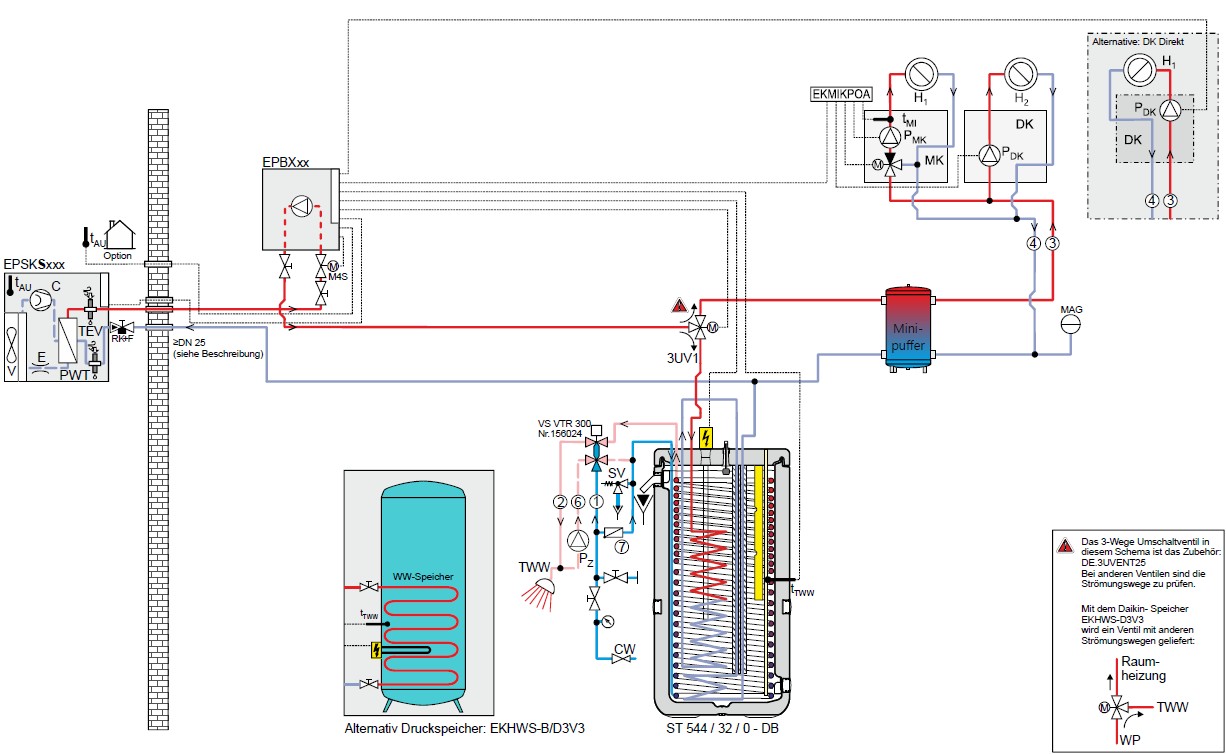 2. Parallelpuffer (Genau nach Daikin Schema. Ineffizienter, aber löst beide Probleme)