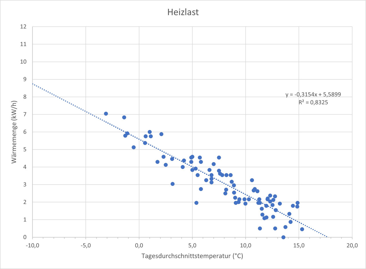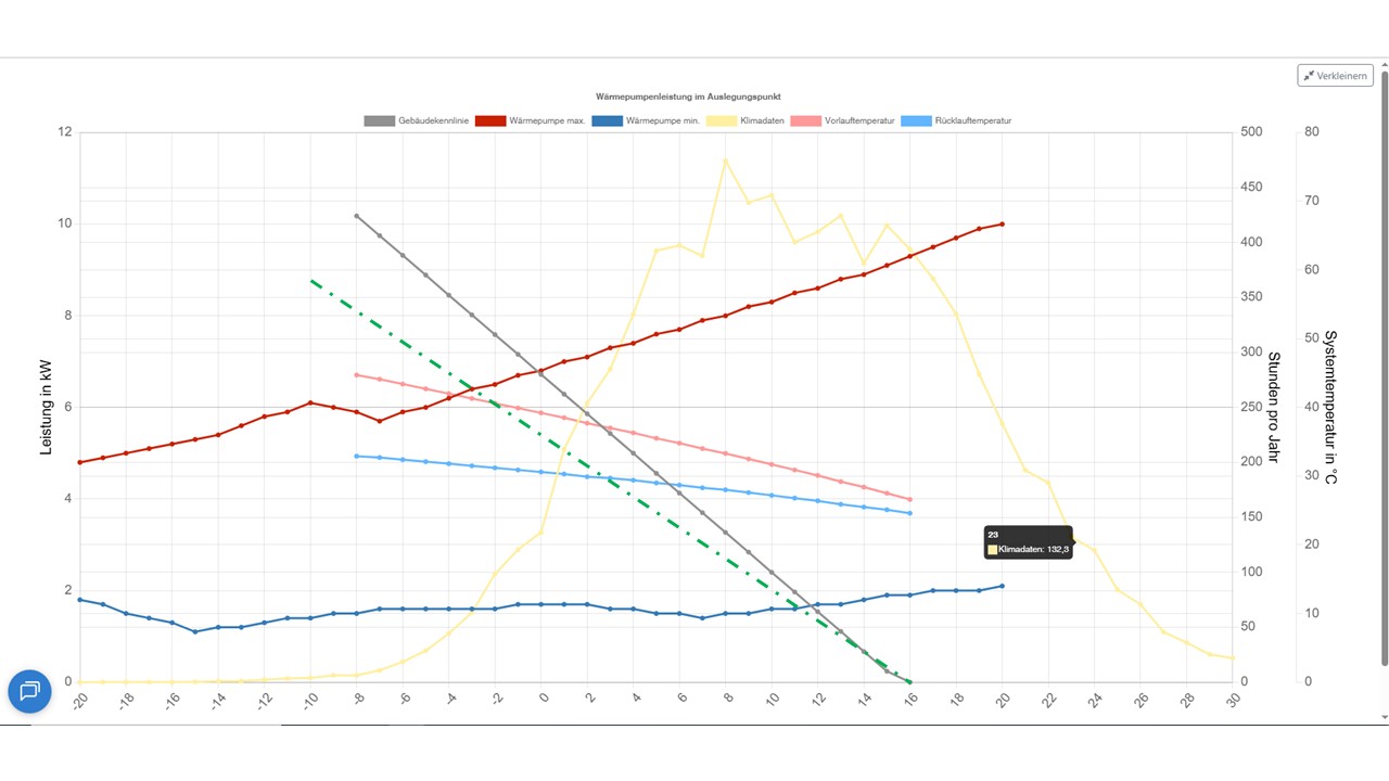 Mit unserer gemessenen Heizlast hätte die 7er den Bivalenzpunkt bei -3,5°C (grüne Linie).