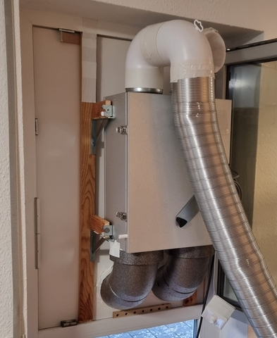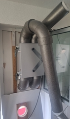 Zu Punkt 2 habe ich (nur) einmal den CO2 Gehalt direkt in der Zuluft gemessen, da ich oft in höchster Stufe kaum große Unterschiede zur mittleren Stufe in meinen CO2 Messwerten gesehen habe bzw. hier generell Schwankungen in der Effektivität meinte zu sehen. Ergebnis war ca. 530 ppm. Ich habe also einen Luft-Kurzschluss. Für eine bessere Dämmung der Verrohrung innen und eine alternative Verlegung der Verrohrung außen habe ich noch einmal 80 € in zusätzliche Verrohrung investiert. Aktuell sieht es noch so aus (siehe Bild).