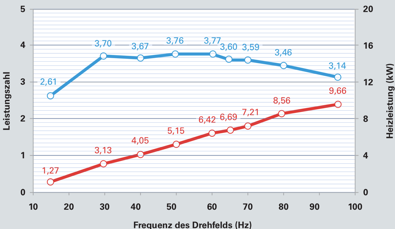 Zitat von anudanan  Ich vermute, die kleinste Wärmeleistung, die sie abgeben kann, sind dann um die 2kW Ja, so messen wir das auch! In der 6er, der 8er und der 10er Variante arbeitet dasselbe Kältekreissystem - 100% identisch, aber entsprechend in der Höchstdrehzahl gedrosselt. Man muss wissen, dass der COP zwischen oberer und unterer Meodulationsgrenzw bei gegebenenr VLt und Spreizung nicht eine hrozitontale Linie ergibt, sondern wie ein Hügel mit Plateau aussieht. Ich habe hier mal einen typischen Verlauf einer Viessmann - WP einkopiert...der von der Altherma dürfte von seiner Charakteristik her ähnlich sein: Es ist klar erkennbar, dass an der unteren Modulationsgrenze der COP schlechter wird und an der oberen auch. Das hat rein technische Gründe. Beschneidet man nun per Software"deckel" den obersten erlaubten Drehzahlbereich, schneidet man den Einbruch an der technisch möglichen Obergrenze quasi ab d.h. der Verdichter aus "seiner Sicht" arbeitet noch im Plateaubereich, darf aber nicht "mehr" liefern. Gruss - Eddi