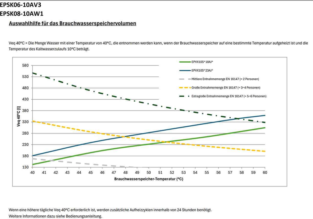 Zitat von TianTian  [...] Klar wird das Wasser gemischt. Aber wenn man mit 47 Grad im Tank anfängt und auch nur 120 Liter für ein Bad rausnimmt, danach noch 10 Minuten duscht, dann ist anschließend im Tank eben nicht mehr wirklich viel WW vorhanden. Moin TianTian, ich weiss, grau ist alle Theorie...aber es lohnt trotzdem, mal hineinzusehen, was Dein 230 L WW-Speicher (klassische Speicherung) denn so kann, wenn er mit 47°C heißem Wasser gefüllt ist: Gehen wir von einem Bad mit 40°C (alles andere wäre viel zu kreislaufbelastend und auch kaum aushaltbar) und 190 L Füllvolumen aus und einem Duschvorgang bei 40°C von 10 min mit etwa 12 L/min am Duschkopf (ich dusche bei 38° Thermostateinstellung; 40°C wären mir persönlich zu heiß). Mein 14 Jahre alter Duschkopf liefert 12/min - nachgemessen. Die meisten heutigen Köpfe liefern 8 - 10 L/min bei besserer Wasserverteilung. Diese Herstellergrafik zeigt uns, wie hoch das soganenannte Schüttvolumen deines 230L Speichers ist, wenn er tatsächlich von oben bis unten mit 47°C beladen wurde und deine 16 h lang unterbrechungsfrei durchlaufende Zirkulation Dir nicht schon wieder 30% rausgeklaut hat: gehst Du von der X-Achse bei 47° senkrecht hoch bis zur blauen Linie und dann nach rechts, kannst Du an der Y-Achse 240 L ablesen. Was sind das für " 240 L"? Es ist das sogenannte Schüttvolumen - also die Menge, die ein Speicher an warmem Mischwasser von 40°C erzeugen kann, wenn das zum Abmischen verwendete kalte Trinkwasser 10°C hat und es natürlich auch bei der Entnahme von WW den Speicher von unten langsam füllt. Da es schwerer als warmes Wasser ist, entsteht eine Schichtung und das Schüttvolumen ist dann erreicht, wenn der Speicher oben weniger als 40°C hat. Soweit logisch? Nun lass uns mal rechnen: 190L + 10 x 12 L = 310 L an 40°C wamem Wasser. Es braucht dafür 250 L Wasser, das 47°C warm ist; der Rest ist 60L 10° kaltes Trinkwasser zum Abmischen. --> Geht also nicht, weil Dein Speicher "nur" 230 L hat - wie Du beobachtest. Mit ein bisschen Physik wird das sofort plausibel. 250 L Wasser mit 47°C ist eine Wassermenge, in die 10,75 kWh an Wärme gesteckt werden mussten, damit es von 10 auf 47°C erwärmt wurde. Zum Vergleich: damit könntest Du Dein Haus bei 4,5 °C ungefähr 6 h lang heizen. Aber: Gehen wir nochmal mit 52°C in die Grafik: -> wir kommen bei 310 L raus. Das trifft Deine Beobachtung "bei 52°C passt es"-> für sagen wir mal 260 L Schüttvolumen bräuchte es allerdings nur 48 - 49°C, so die Physik. Es "könnte" also reichen, den Speichersoll auf 49°C zu stellen. Nun schauen wir mal gemeinsam, welche Menge Wasser in Deinem Speicher von 10°C Trinkwassertemperatur auf 52°C Speichertemperatur im Januar tatsächlich erwärmt wurden, wenn Dein Stromverbrauch dafür 288 kWh betrug - die Rechnung ist einfach: Im Januar war es so um 0°C im Tagesmittel...Da hat die 4H eine WW-Arbeitszahl von ca. 3. -> 288 kWh x 3 = ~864 kWh an Wärme (du kannst in der App nachsehen, wieviel es wirklich war) Wieviel Wasser können damit von 10°C --> 52°C erhitzt werden?--> 864 / 1,1625 *(52 -10) = 17,7 m³ ... dafür braucht es einen LKW-Tankzug. Teilen wir das durch 31 Tage, kommen wir auf 570 L an 52°C heissem Wasser pro Tag. Tatsächlich werdet ihr mit 2 Personen und gelegentlichem Bad so um 130 L an Heißwasser mit 52°C verbrauchen, aus denen dann ~ 180 L Warmwasser mit 40°C werden. Es verschwindet also Wärme aus dem Speicher - und zwar mehr als das Doppelte von dem, was ihr nutzt. Wie geht das? Antwort ist einfach: zum größten Teil über die 16 h durchlaufende Zirkulation..... Es macht also ganz viel Sinn, dass Du nun "auf Anforderung per Tastendruck" ändern willst: Ich würde als Laufzeit der Pumpe 3 min einstellen. Braucht man viel Wasser ausser der Reihe z.B. für ein Bad, sind die ersten 3 L, die kalt aus dem Auslauf kommen, völlig schadfrei. Es kommen ja 187 L warmes Wasser nach. Anders als beim Duschen braucht man also noch nicht mal einen Tastendruck. Wenn das über KNX gut geht, mach es. Hysterese 8 K scheint mir gut für den Start. Warmhalten mit Programm einstellen am Regler und ein Zeitfenster festlegen, wo der Speicher nachgeladen werden soll. Ich würde hier mit einem Fenster 14 Uhr - 18 Uhr starten. In der Tagessicht kannst Du in der App bei Strombedarf für WW sehen, wie oft der Speicher geladen wurde. Je mehr PV-Strom jetzt kommt, desto mehr steht der WP dann für Heizen zur Verfügung, weil sie da nur 400 - 600 W braucht, für WW aber 1,5 - 2,3 kW. Gruß - Eddi