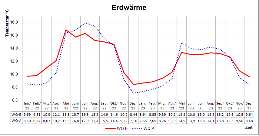 Hier die Erdwärmedaten als Grafik. Bei den Daten handelt es sich stets um Mittelwerte aus jeweils rund 2880 Messwerten/Monat. Bohrung 137,5 m Entnahme < 5 MW inkl WW Einlagerung < 5 MW seit 2023 <4 MW |