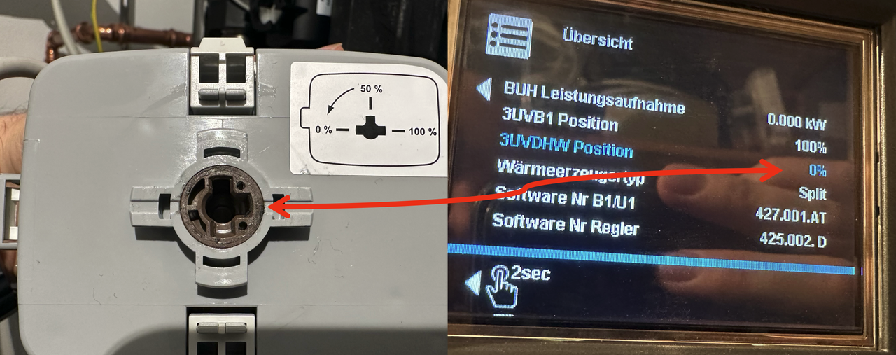 Zitat von CK_11  Also hab ich von 100% (nach links umgekipptes T -> WW Aufbereitung) auf 0% (nach rechts umgekipptes T - voller Heizkreislauf) gestellt[...] Jetzt bin ich etwas verwirrt. Die Stellungen müssen wie folgt sein, bei Blick von unten auf den Stellmotor: Standby (Außengerät aus) DHW auf 0% B1 auf 100% WW-Bereitung DHW 100% B1 100% Heizen DHW 0% B1 0% Das Foto vom Display zeigt eine korrekte Standby-Situation (Kompressor aus, Umwälzpumpe an).