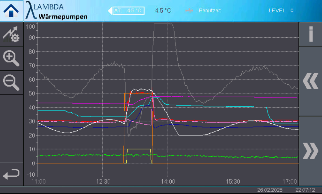 Zitat von ChristofP  Eine Nachfrage dazu: Welche Vorlauftemperatur liegt "immer unterhalb der der eingestellten Heizkurve (bis zu 2,5 K)" also der Soll-Temperatur?? Der Vorlauf der Wärmepumpe oder der Vorlauf im Heizkreis? Nach meiner Erfahrung strebt der Vorlauf der WP recht gut den Sollwert[...] Hallo ChristofP es ist der Vorlauf der WP, der sich nur im Minus- Temperaturbereich nicht mehr auf die VL-Soll-Temperatur einregelt und dann bis zu 2,5 K darunter liegt. Diese Abweichung etabliert sich auch außerhalb der zyklischen Enteisung über einen großen Zeitraum. Den Durchfluss der WP habe ich schon auf 38% (min 0,8 m³/h) begrenzen lassen, damit dieser immer etwas höher ist als der Durchfluss der HZK- Pumpe. In dem Minus-Temperaturbereich regelt der Verdichter (VdA-Rating) immer nur kurz die Leistung hoch und kommt dann wieder auf die Min-leistung (25%) herunter. Es ist also keine gleichmäßige Anhebung der Verdichterleistung, um die erforderliche Leistung linear zur Verfügung zu stellen. Auch das Volumen der Ladepumpe (HLP-Rating) im WP-Kreislauf arbeitet nun in einer deutlichen größeren Leistungs-Range. Das Schwingen der HLP-Kurve ist deutlich größer im Vergleich zu dem Regel-Verhalten bei höheren Außentemperaturen. Meinst du, dass die Ursache auf einem falsch eingestellten PID- Regler zurückzuführen ist?