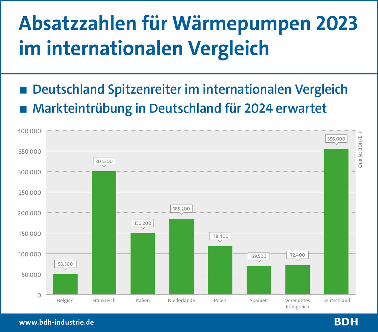 In Frankreich, Italien, Schweden, Finnland, Polen, Dänemark, Österreich und der Schweiz ist der Absatz von Wärmepumpen im vergangenen Jahr zurückgegangen. In Portugal, Belgien, Norwegen, den Niederlanden, Spanien und Deutschland stieg er zwar an, doch reichte dies nicht aus, um den Gesamtrückgang auszugleichen. Zusammengenommen machen die Absätze in den gemeldeten Ländern 90 Prozent des EU-weiten Wärmepumpenmarktes aus. [...] Nein, ist es nicht. Deine Aussage ist falsch. Richtig ist, dass der Absatz europaweit geringer ist, aber die erwähnten Nachbarländer haben trotzdem höhere Zubauzahlen.