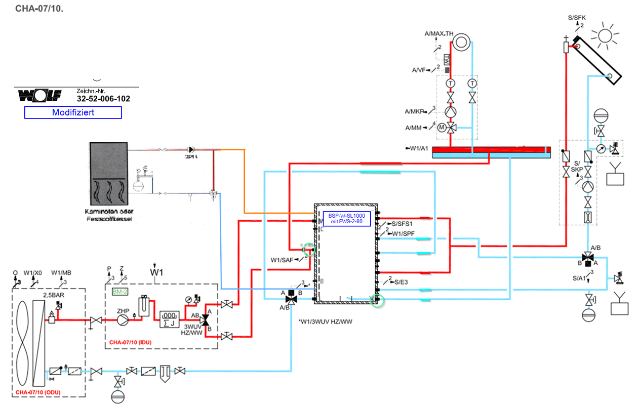 Zitat von Frank_Pantry  Die Heizlast ist garantiert verkehrt,..... Also vernünftig dimensionieren (per WMZ oder per qualifizierter Heizlastberechnung, nicht 0815 über ein wärmepumpenaffines Ingenieurbüro) und dann weiter planenBj. 89)[...] Ich habe jetzt von einem professionellen Energieberater eine Heizlastberechnung von meinem Haus machen lassen. Danach ergibt sich eine Heizlast von 8,7kW Obwohl ich die Berechnung meinem HB vorgelegt habe, bestand er nach wie vor auf die 16-er von NIBE. Deshalb haben sich unsere Wege hier getrennt.... Nun habe ich mir 3 zertifizierten WOLF-Fachbetriebe ins Haus geholt. Hier wird mir von 2 Betrieben aufgrund der Heizlast die CHA07 empfohlen und der andere Betrieb setzt eher auf die CHA10. Was meint ihr, ist die CHA07 ausreichend? Was mir sehr gut an dem WOLF-Konzept gefällt, ist der Schichtenspeicher BSP-W-SL1000 mit FRIWA von denen. Hier das entsprechende Hydraulikschema Dort ist insbesondere die Einbindung des Speichers mit T-Stück aus meiner Sicht gut gewählt. Was meint ihr? Vielen Dank für eure Rückmeldungen.
