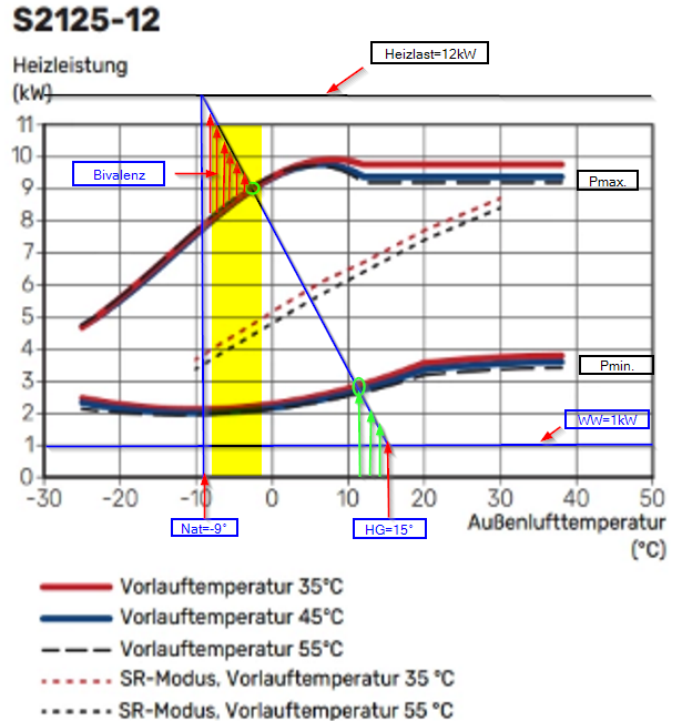 Ja, da hast Du wohl recht. Es handelt sich eher um eine 12er bzw. 16er Variante und nicht kW Angabe. Die 16er schafft ja nach obigen Leistungsdiagramm deutlich weiter Richtung NAT zu kommen. Wo hingegen die 12er schon bei -3°C theoretisch zuheizen müsste. Meine Bedenken bei der 16er sind, dass sie aufgrund der min.Leistung von 5kW einfach zu früh (ab ca. +5°C) bis zur HG (15°C oder höher) anfängt zu takten. Während die 12er dies erst ab ca. +12°C macht. Wobei die JAZ der 16er (ca. 4,92) bei VL45°C besser ist als bei der 12er. (ca. 4,6) Es stellt sich mir einfach die Frage, was ich eher in Kauf nehmen sollte. Mehr Takten bei der 16er oder öfteres zuheizen bei der 12er ab Bivalenz unterhalb -3°C.