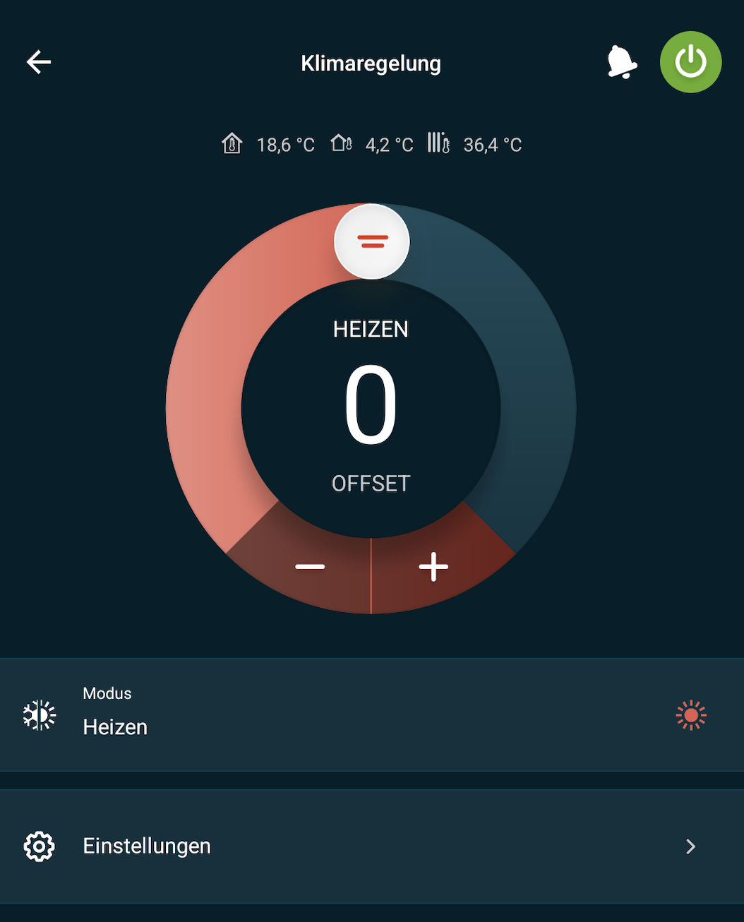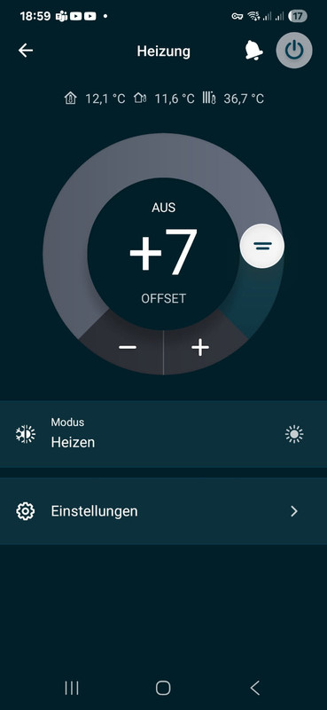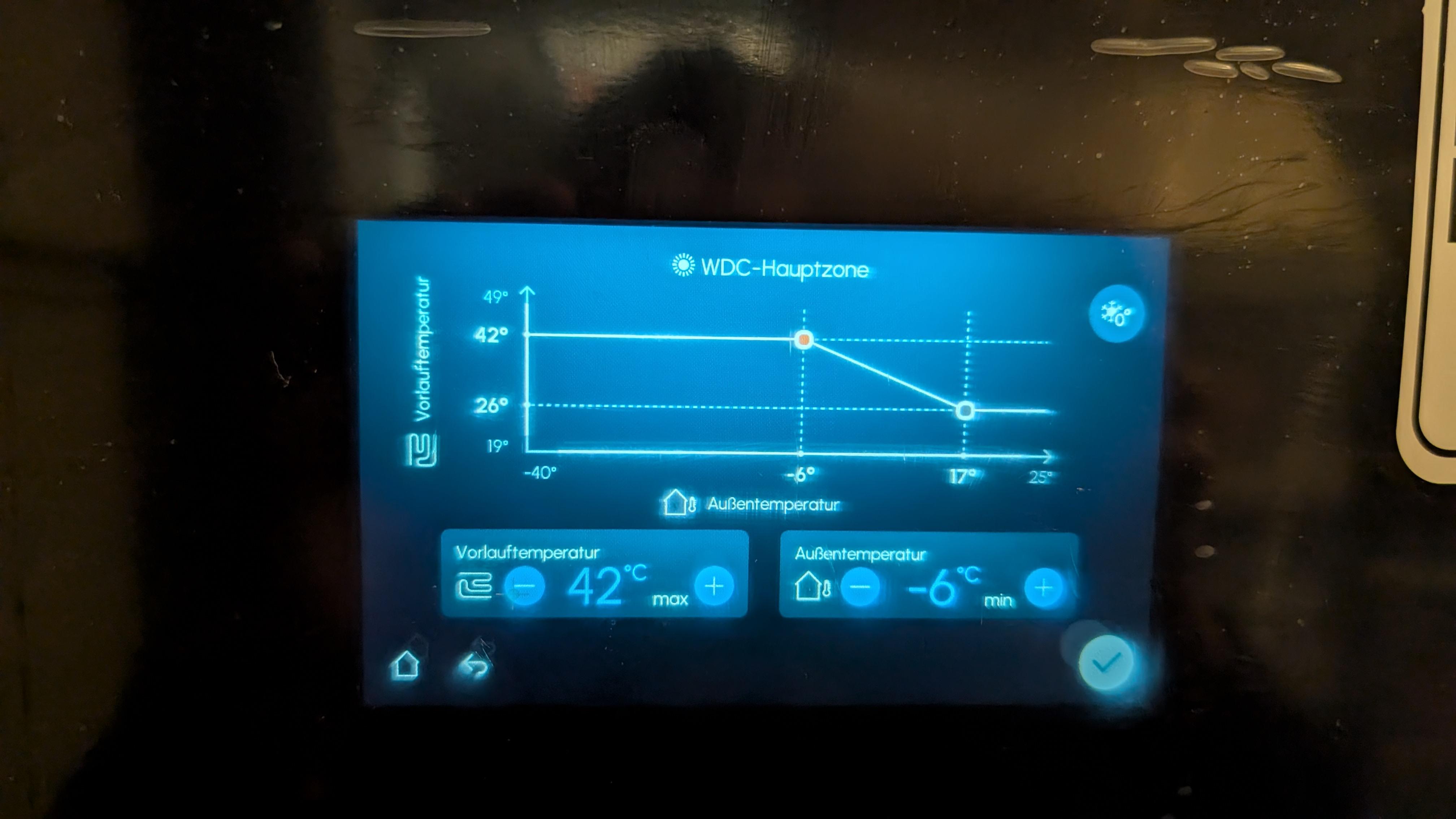 Zitat von TianTian  Zitat von WarmerAlex  [...] Unter dem Punkt Vorlauftemperatur war 55 Grad eingestellt: [Bild] Zitat von RalfiWP  [...] Wir haben in jedem Raum ERR. Offen sind die dann je nach Nutzung, im Schlafzimmer soll es schließlich kühler sein als im Wohnzimmer. Wir haben Strawather 55-005076 Stellmotoren die ich über KNX Heizaktoren steuere. Das sollte nur die maximal/minimal mögliche Temperatur für witterungsgeführte Heizkurve sein. Die Heizkurve sagt bei welcher Außentemperatur welche Vorlauftemperatur generiert werden soll. Durch Delta T (Vorlauf minus Rücklauf) kann man definieren wieviel Wärme im Haus bleiben soll. Hier siehst du eine Heizkurve, man kann durch "tippen" auf die Endpunkte die Werte verändern. Eddi hat ja bereits was zur ERR geschrieben. Wenn du ohnehin in manchen Räumen nur eine feste Temperatur haben möchtest, dann kannst du das über den hydraulischen/thermischen Abgleich erreichen. In allen Räumen ERR nutzen bringt für die WP Probleme mit sich. In der Onecta App kannst du auf "Klimaregelung" klicken und siehst die folgende Ansicht: Die drei Temperatur oben sind: Innentemperatur (Madoka), Außentemperatur, aktuelle Vorlauftemperatur. Die Vorlauftemperatur kann, besonders bei der Warmwasserbereitung, auch über 50 Grad steigen - ohne das die 50 Grad wirklich in die Heizung gehen. Meine Werte sehen im Moment so aus. Ich spiele noch ziemlich rum. Besonders bei der WW Bereitung habe ich mal testweise den kompletten 230l Speicher per Heizstab manuell aufgeheizt.... das wird noch kompensiert :D Die Werte stammen alle aus der Onecta APP. Die Werte sind überraschend genau. Ich habe diese mit Shelly und WMZ verglichen. Die Diagramme zeigen die wöchentlichen Werte an, vorher war die Auswertung fehlerhaft: VG