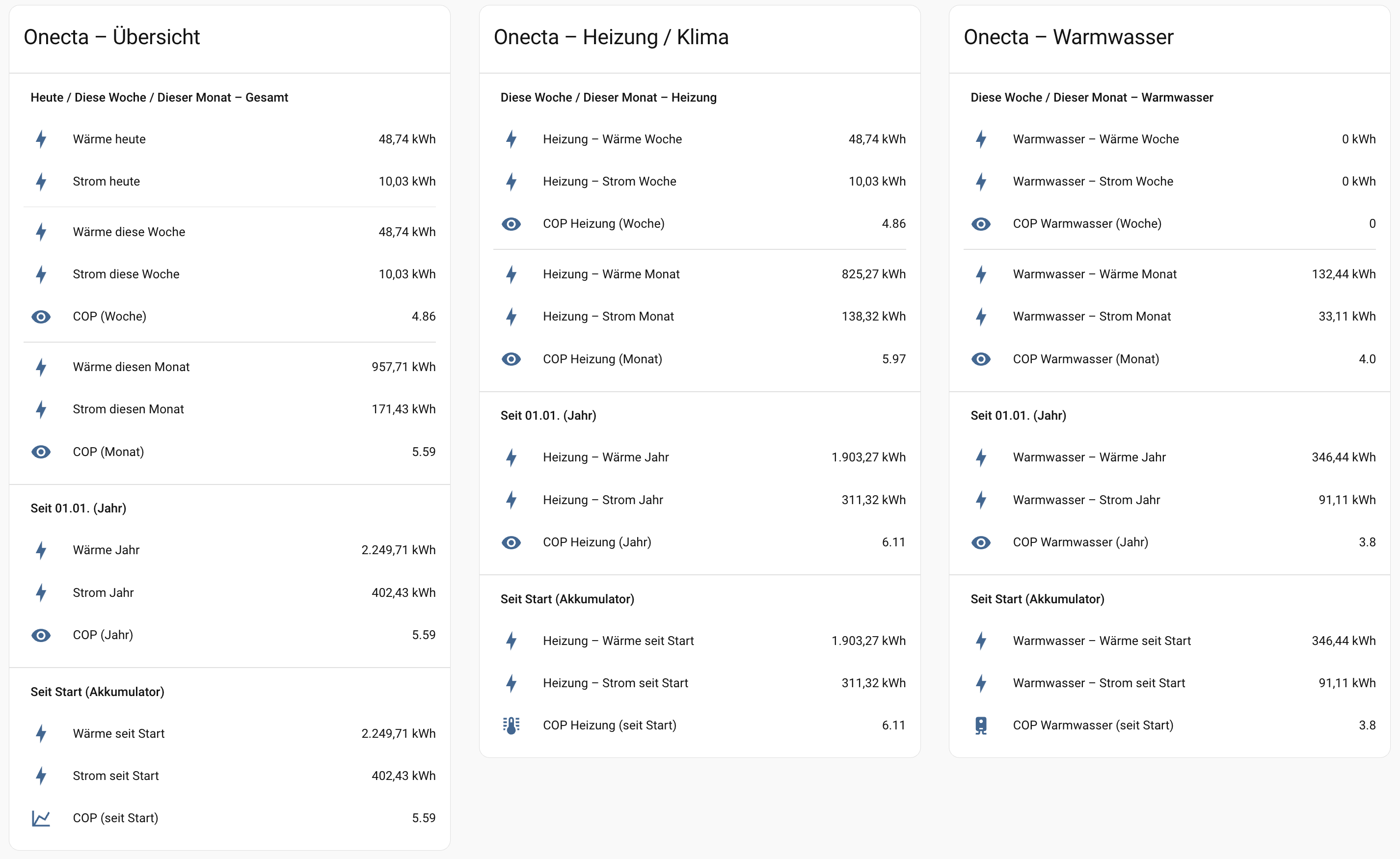 Zitat von Maxi991234  Zitat von Eddi Lang  [...] Vielen Dank, mal schauen ob es sich als gute Lösung herausstellt oder auch nicht :D Also meine Anlage verbraucht Laut Fusion Solar 1,5 kWh. Diese Werte kann ich ebenfalls der App entnehmen. Dort wird ja der Verbrauch scheinbar auf 2 Stunden[...] Die Frage ist doch wieviel Wärme wurde mit dem Strom erzeugt...Was sagt denn die Onecta App zum Verbrauch und der erzeugten Wärme? Wie ist dort der COP?