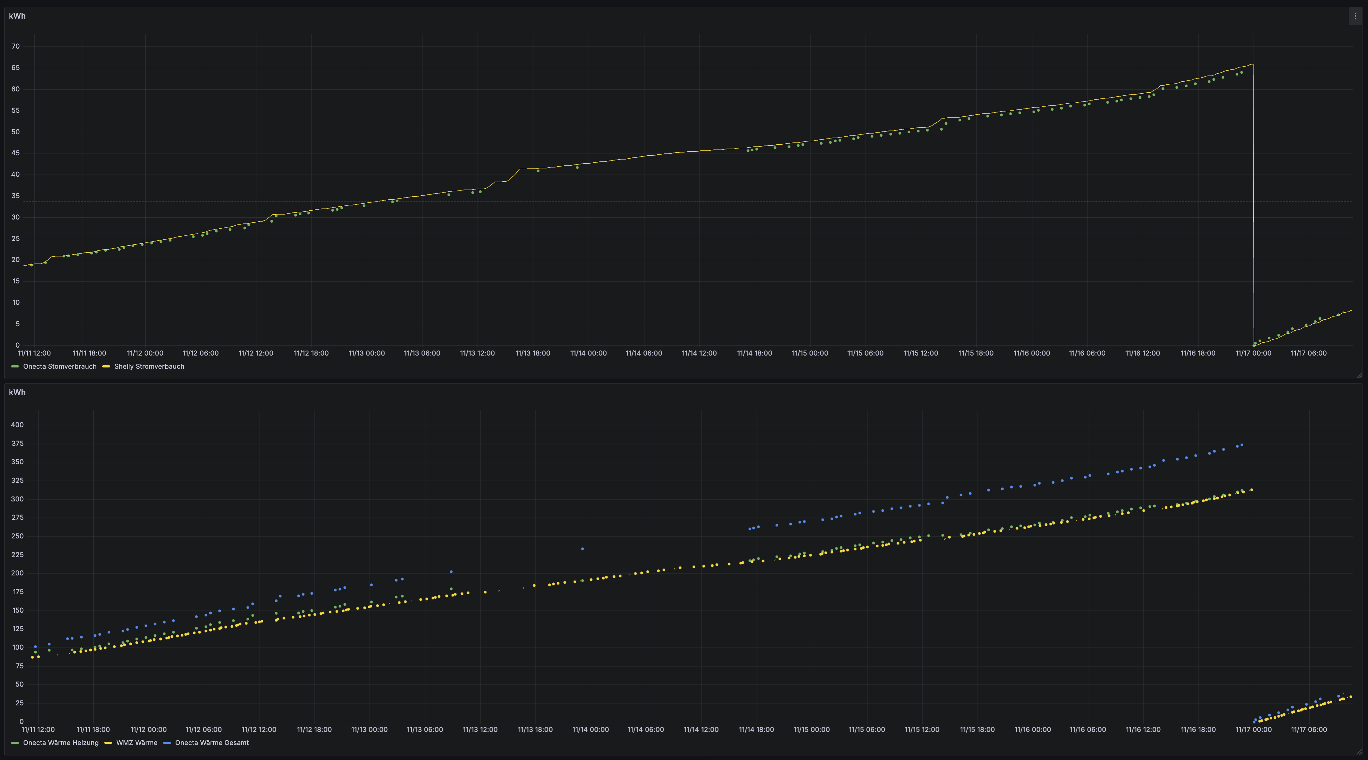 Zitat von Maxi991234  Zitat von Eddi Lang  [...] Vielen Dank, mal schauen ob es sich als gute Lösung herausstellt oder auch nicht :D Also meine Anlage verbraucht Laut Fusion Solar 1,5 kWh. Diese Werte kann ich ebenfalls der App entnehmen. Dort wird ja der Verbrauch scheinbar auf 2 Stunden[...] ...da hat Mans erstmal einen guten Punkt aufgebracht: wieviel Wärme wurde für Heizen und für WW erzeugt und wieviel Strom dafür lt. App verbraucht? Es reichen die 4 Werte für den November, denn die App gibt für die erzeugten Wärmemengen WW und Heizen jeweils maximal die Monatsauflösung raus. Da Dein Haus ein Neubau ist, hast Du bestimmt eine genaue Heizlastberechnung (Transmisssionsverluste in kW? Lüftungsverluste in kW?). Und wie ist deine 4 H ans Haus hydraulisch angeschlossen? So "ohne alles" kann man nur vermuten....und ja, der Wert auf 24h gerechnet = 1,5 x 24 = 36 kWh scheint erstmal hoch. Möglicherweise musst Du in die Einstellungen der WP tiefer eintauchen - siehe TianTian.... Meine Schwägerin (sanierter Altbau, 200 m², gemessener Heizlast 6,3 kW bei NAT=-10°C und gemessenem Jahrewärmebedarf von ~ 14.500 kWh incl. WW) hat ebenfalls eine 4H mit 8 kW und sie fährt Nachtabsenkung um 2°C. Bei 6°C AT brauchte sie am Samstag 50 kWh Heiz- und 6 kWh WW-Wärme. Strombedarf: 7,1 kWh für Heizen und 1,6 kWh für WW. Strombedarf ist deswegen relativ gering, weil es die Tage davor draussen wärmer war und das Haus noch von gespeicherter Wärme in den Außenwänden protftierte. "Normal" wären bei Direktanbindung der WP ohne Puffer für 6°C = 33°C VLT u. Spreizung 5K bei ihr ca. 8,x kWh für Strom zur Erzeugung von 50 kWh Heizwärme (wir messen die Tagesarbeitszahlen mit WMZ im Heizkreisrücklauf zum IG und Shelly für den Außengeräteanschluss. El. Zuheizer ebenfalls m. Shelly wurde bisher fürs Heizen nicht benötigt - geht mitunter bei WW-Bereitung und gleichzeitiger Ölrückführung rein). Gruß - Eddi