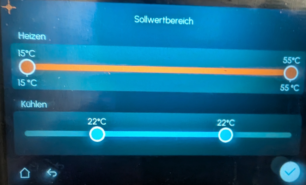 Zitat von TianTian  Zitat von WarmerAlex  [...] Unter dem Punkt Vorlauftemperatur war 55 Grad eingestellt: [...] Tian Tian, mich beschleicht der Eindruck, dass möglicherweise keine gute Übergabe der Funktion und Einstellungsmöglichkeiten des Reglers an Dich erfolgt ist. Möglicherweise hat Dein HB bzw. der Daikin-Techniker auch nicht alles sinnvoll und richtig konfiguriert - Du wärst da nicht der erste... Deswegen ganz direkt gefragt:was ist denn bei "Hauptzone" unter 1.5 "Heizen-Sollwertmodus" eingestellt? Es sollte "witterungsgeführt" eingestellt sein. Ist "Konstant" eingestellt 8= Werkseinstellung!), fährt sie nach der Vorgabe in 1 "Hauptzone" Menupunkt 1.39 "Vorlauftemperatur", den Du wahrcheinlich oben gemeint hast. Das Bild darunter zeigt m.E. aber den Menüpunkt 1.6 "Sollwertbereich". Bei Einstellung von 1.5 auf "witterungsgeführt" kannst Du in 1.8 "witterungsgeführte Heizkurve" dann die VLT in Abhängigkeit von der AT einstellen. Es sind 2 Wertpaare einzustellen: 1 VLT-Sollwert bei AT = Temperaturgrenze Heizbetrieb für Dein Haus (nennt sich auch Heizgrenztemperatur = HGT). Das musst Du selbst herausfinden, ab welcher Tagesmitteltemperatur Du heizen musst und die zugehörige VLT für Deinen Heizkeis. Die HGT musst Du zusätzlich in 3.1 "Betriebsbereich" für das Heizen einstellen (Werkseinstellung sind unsinnige 20°C). Willst Du auch kühlen, stellst Du dort auch die Untergrenze der AT (= AT im Tagesmittel) ein, oberhalb der gekühlt werden soll (Werkseinstellung sind unsinnige 18°C). 2 VLT-Sollwert bei NAT = Normaußentemperatur. Laut der Norm DIN EN 12831 ist es das tiefste Zweitagesmittel der Lufttemperatur, das innerhalb eines 20-Jahres-Zeitraums mindestens zehnmal aufgetreten ist. Auf diese Temperatur werden in Deutschland die Heizungen grundsätzlich ausgelegt. Nun musst Du noch 1.6 einstellen: Werkseitig eingestellt ist "konstant" 20°C - 55°C für 1.6 als Unter- und Obergrenze der VLT für das Heizen. Hier wird aber nur festgelegt, innerhalb welcher Grenzen sich die VLT im witterungsgeführten Betrieb überhaupt bewegen darf. Es empfileht sich, den oberen Grenzwert ca. 5 K höher als die max. VLT bei NAT einzustellen und den unteren Grenzwert ca. 2 - 3 K unterhalb der VLT bei der HGT einzustellen. Das wäre erstmal das Allerwichtigste zur Frage, wie man die witterungsgeführte VLT-Linie einstellt.Die Zahlen hier ( 1.39 etc) kannst Du im Reglerdisplay sehen, wenn Du im Monteursmodus (PINCode: "5678" ) in 5 "Einstellungen" im Menüpunkt 5.4 "Brotkrumen" (breadcrumbs) den Schieberegeler auf "ein" stellst. Das macht das Finden der Menüpunkte, die alle im Referenzhandbuch für die Konfiguration des Reglers beschrieben und dort auch so nummeriert sind, viel einfacher. Das Handbuch gibt es nicht in Papierversion, sondern nur online. Hier ist der link, falls Du dieses nützliche Ding nicht kennst. Ohne das bist Du IMHO "komplett aufgeschmissen", wenn Du die Anlage richtig einstellen willst. Möglicherweise hat Dich Dein HB auch nicht auf das Handbuch hingewiesen. Weiterhin wichtig für Dich ist die Tabelle der werkseitigen Einstellungen des Reglers: Du findest sie hier ab Seite 244. Im gleichen Handbuch findest Du auch die Liste der Fehlercodes...nur für den Fall... letzter Hinweis:Forist Mans schreibt von der Madoka, die Du offenbar nicht hast. Das Daikin-Zubehörteil namens Madoka ist ein kleiner Bediensatellit, den man sinnvollerweise in dem Raum montiert, in dem man sich die meiste Zeit aufhält - z.B. der Wohnbereich. Gimmick der Madoka ist, dass sie einen Raumtemperatursensor (=RT-Sensor) hat. Damit bekommt der Regler sozusagen eine Brille: er kann nun die RT "sehen": ohne Madoka kann er nur ermitteln, ob Heizbedarf vorliegt und das tut er anhand der Abweichung der VLT von der Soll-VLT gemäß witterungsgeführter Kurve. Fällt die VLT bei Verdichterbetrieb = aus unter den Sollwert, scheint Wärmebedarf vorzuliegen und der Verdichterbetrieb wird gestartet. Schießt sie um den im Punkt 3.7 "max Heizen-Überschwingung Vorlauftemperatur" eingetragenen Wert hinaus, wird der Verdichter abgeschaltet ((Werkseinstellung sind unsinnige 3K - den Wert solltest Du auf das Maximum stellen, damit Deine Takte in der Übergangsperiode möglichst lang bleiben); mit Einstellung "witterungsgeführte Heizlinie" in 1.5 hat die App auch ein anderes Aussehen: rechts oben neben dem Symbol für Fußbodenheizung die Soll-VLT, im roten Kreis die dort einstellbare Erhöhung der VLT ggü. der Soll-VLT, weil es z.B. zu kühl im Raum ist. Mittig die AT und links die Madokaanzeige mit allerdings falscher RT, weil sie bei einem Mit-Foristen, zu dem ich Kontakt habe, leider falsch einkonfiguriert wurde mit Madoka kann er anhand der Abweichung der Ist-RT von der Soll-RT die VLT nach oben oder unten anpassen. Die Installation einer Madoka ist vor allem sinnvoll, wenn man zuhasu ein open-space-Haus hat d.h. es dort ineinander übergehende Wohnbereiche gibt und/oder die Türen zwischen Diele, Küche, Wohnbereich, ARbeitsraum etc üblicherweise offen stehen bzw. nicht vorhanden sind. In einem vor geschlossenen Türen nur so strotzenden Altbau mist eine Madoka eher nicht sinnvoll - (ich habe etagenübergreifend open-space in der Hütte und daher auch eine Madoka im EG, weil es im OG ohnehin besser als im EG gedämmt ist und es 8 m² Veluxfensterflächen hat.). Gruß - Eddi