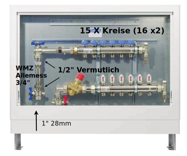 Verteiler- und Sammlerbalken: EDELSTAHLVERTEILER 1 1/4"Laut dem aktuellen Prospekt und dem alten ist ein Verteilerbalken in 1 1/4" verbaut. Wenn diese 1 1/4" etwas sagen zum moeglichen Durchfluss (ca. 60% mehr als 1"), dann sollte dieser ausreichend Ok sein. Selbst fuer den HKV mit 15 Kreisen, oder? Besser geht immer, aber ist das ein grosser Hebel? Gruss und Danke, HNT