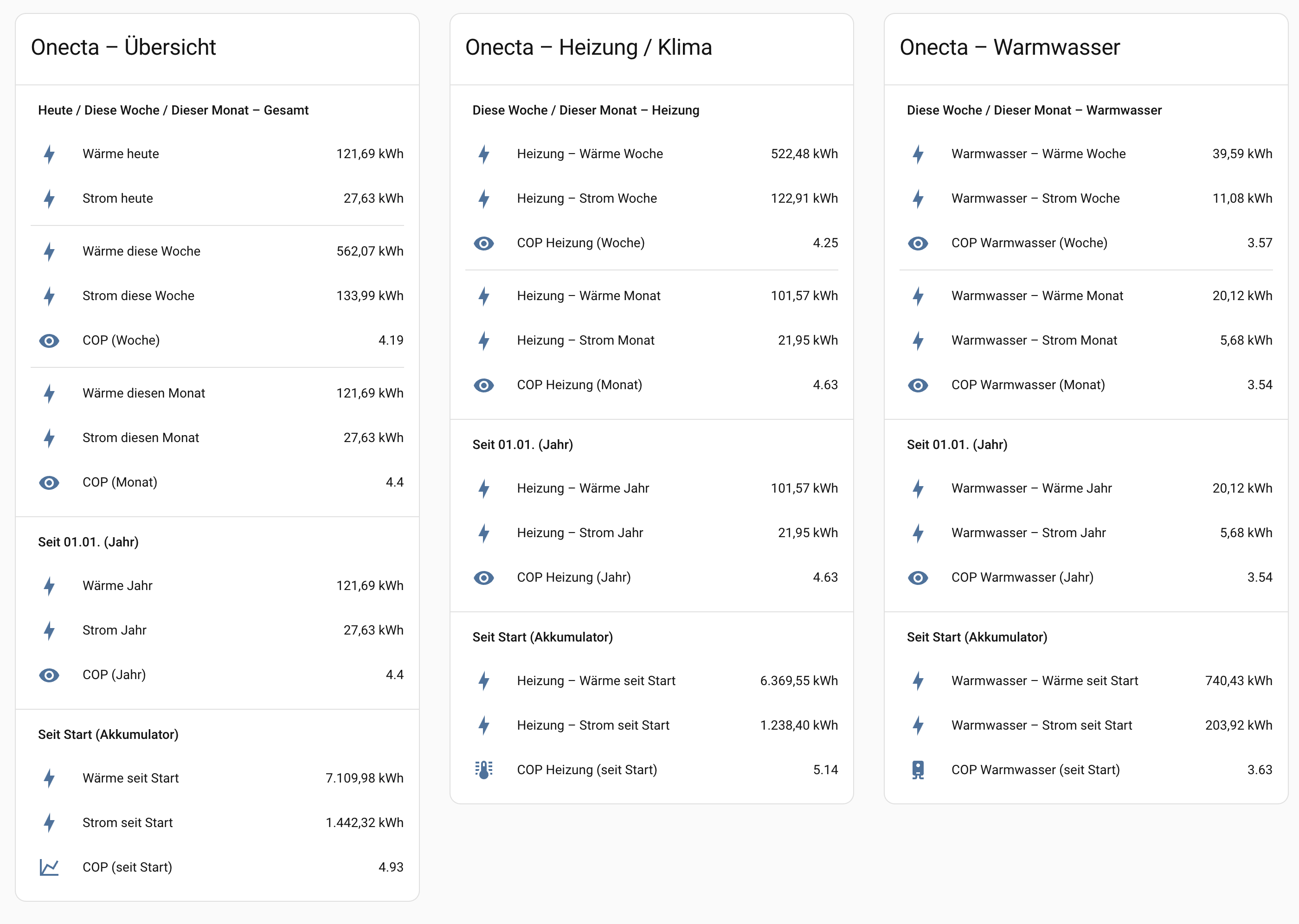 Ich habe fast das gleiche Problem, wie von Frank61 beschrieben und mein Heizungsbauer, sowie der[...] Hey, es ist noch nicht ganz klar wie deine Hydraulik genau aussieht. Generelle Infos zu den möglichen Hydrauliken sind in diesem Video, Wärmepumpen Anlagen - einfach, betriebssicher, effizient (Frank-Rolf Roth). Das ganze Video ist zu Empfehlen. Wenn du gerade weniger Zeit hast, dann habe ich die Zeitmarke in dem Link bereits auf 14:14 MInuten gesetzt. Dort werden die unterschiedlichen Puffer und ihre Vorteile/Nachteile erklärt. Ich besitze ebenfalls eine Altherma 4 und muss gestehen, dass mir nicht klar ist, wie man diese in einem Parallelpuffer, wie wohl bei dir verbaut, effizient nutzen kann. Das geht eigentlich nur mit einem gut geplanten Puffer, mit passenden Ein- und Ausgängen, und vor allem wenn die Pumpe der WP und die Pumpe des Heizkreises exakt das gleiche fördern...passiert das nicht, so hast du immer im Kreis der WP höhere Temperaturen als im Heizkreis. Und hier kommen wir zu einem großen Problem, die Altherma 4 hat keine festen Fördermengen. Man kann die Spreizung zwischen VL. und RL einstellen, die Fördermenge wird dynamisch angepasst. Die Pumpe des Heizkreises läuft aber mit einem konstanten Wert... Besonders seltsam finde ich bei dir, dass der COP bei WW besser ist... Aufgrund der höheren VL Temperaturen für WW sollte das fast unmöglich sein. Welche Vorlauftemperaturen brauchst du denn? Hier mal meine Werte seit Anfang November. Das sind die Zahlen aus der Onecta APP. Besonders interessant sind die Werte der aktuellen Woche, da war es durchaus kalt... die Monats/Jahres Werte wurden ja gerade zurückgesetzt ;) Generell habe ich kein optimales System, meine Trockenbau FBH benötigt bei Minustemperaturen > 40 Grad beim Vorlauf. WW hat heute mehr verbraucht, da heute die Desinfektion lief, die heizt auf 60+ Grad. BTW die Zahlen in Onecta werden bei mir, verglichen mit WMZ und externem Strommesser (Shelly), unter ca 5 Grad ungenauer. Ich vermute, dass Daikin hier einfach die Abtauungen weder beim WW noch bei der Heizung anrechnet...
