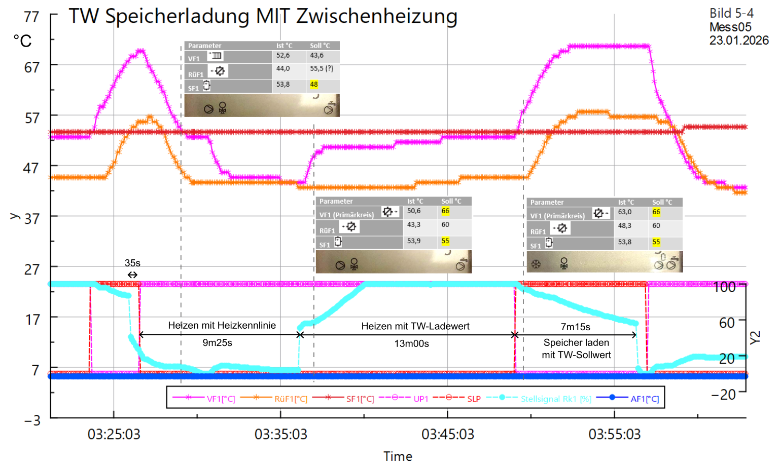 Bild 1: Ein 30min Zyklus mit einer Heizphase und eine Speicherladephase. Nominell sind die Phasenzeiten 10min bzw. 20min. Die VF1-Temperatursollwerte (türkis, Y2) folgen korrekt diesen Phasenzeiten, aber die Pumpenumschaltung (rot bzw. violett, Y2) kommt erst 13min später. Die drei Tabellen zeigen die Werte am Regler-Display zum gekennzeichneten Zeitpunkt. (SL-Einschaltschwelle=48°C; SL Ausschaltschwelle=55°C; SL-Ladetemperatur=66°C)Regler Trovis 5573-0Firmware V2.45
