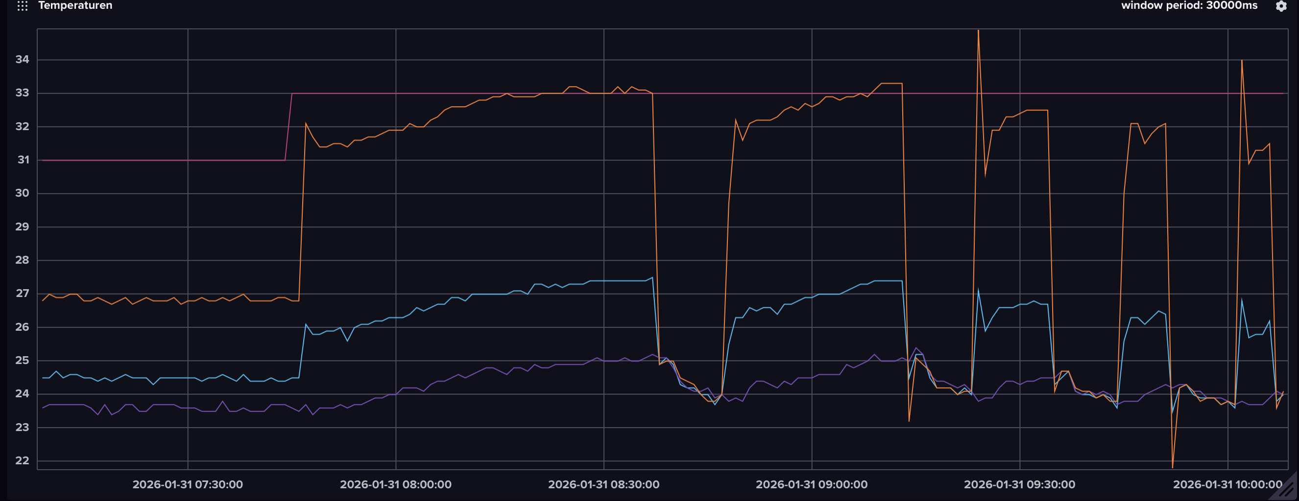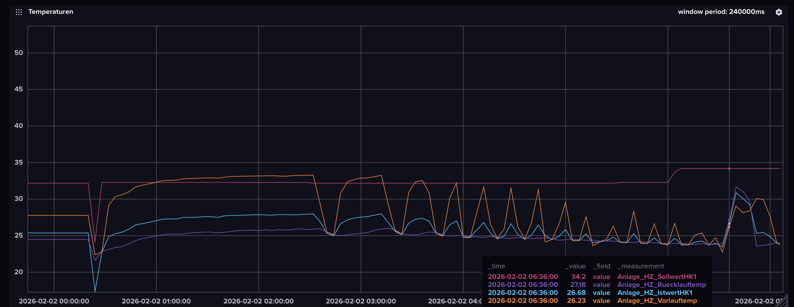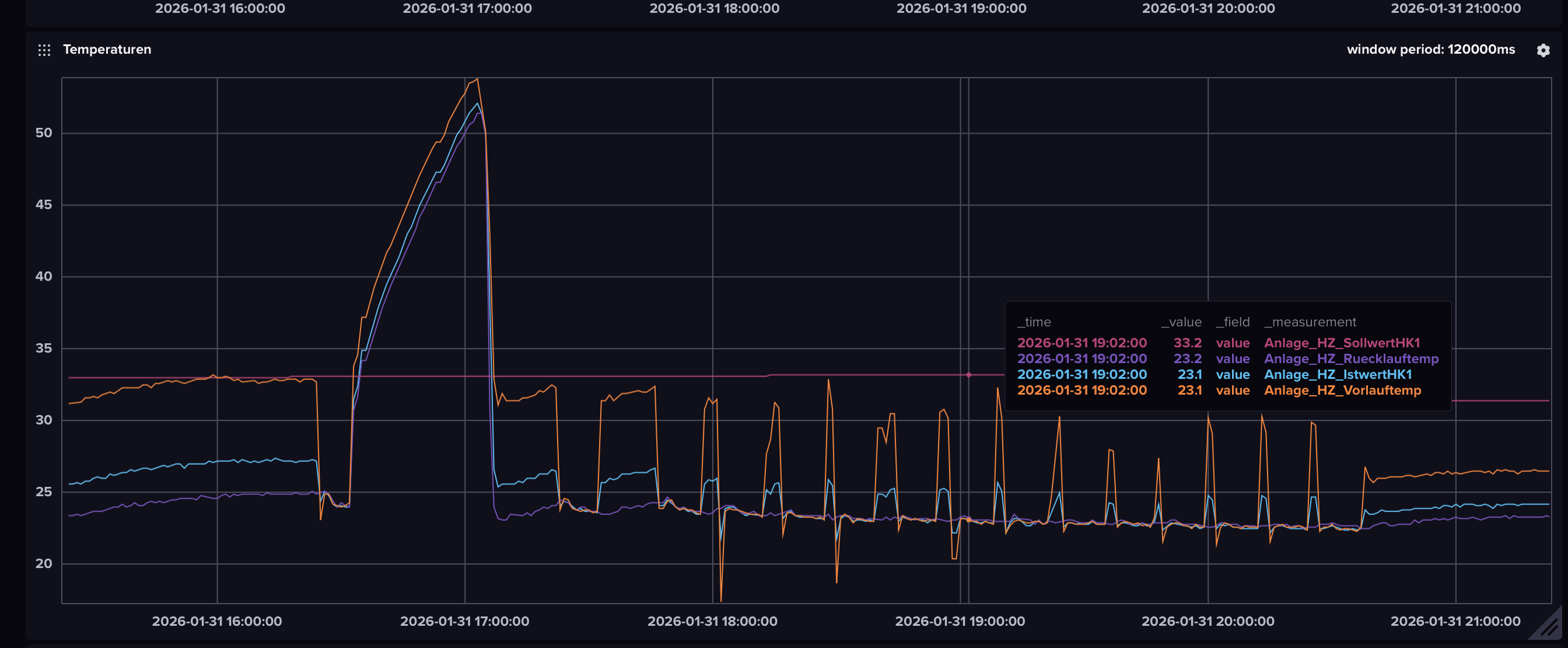 Hier einmal ein Blick auf die Vorlauf- Rücklauftemperatur: Die 33° Vorlauftemperatur erreiche ich im ersten Zyklus über einen längeren Zeitraum. Aber mit jedem Zyklus wird es kürzer.