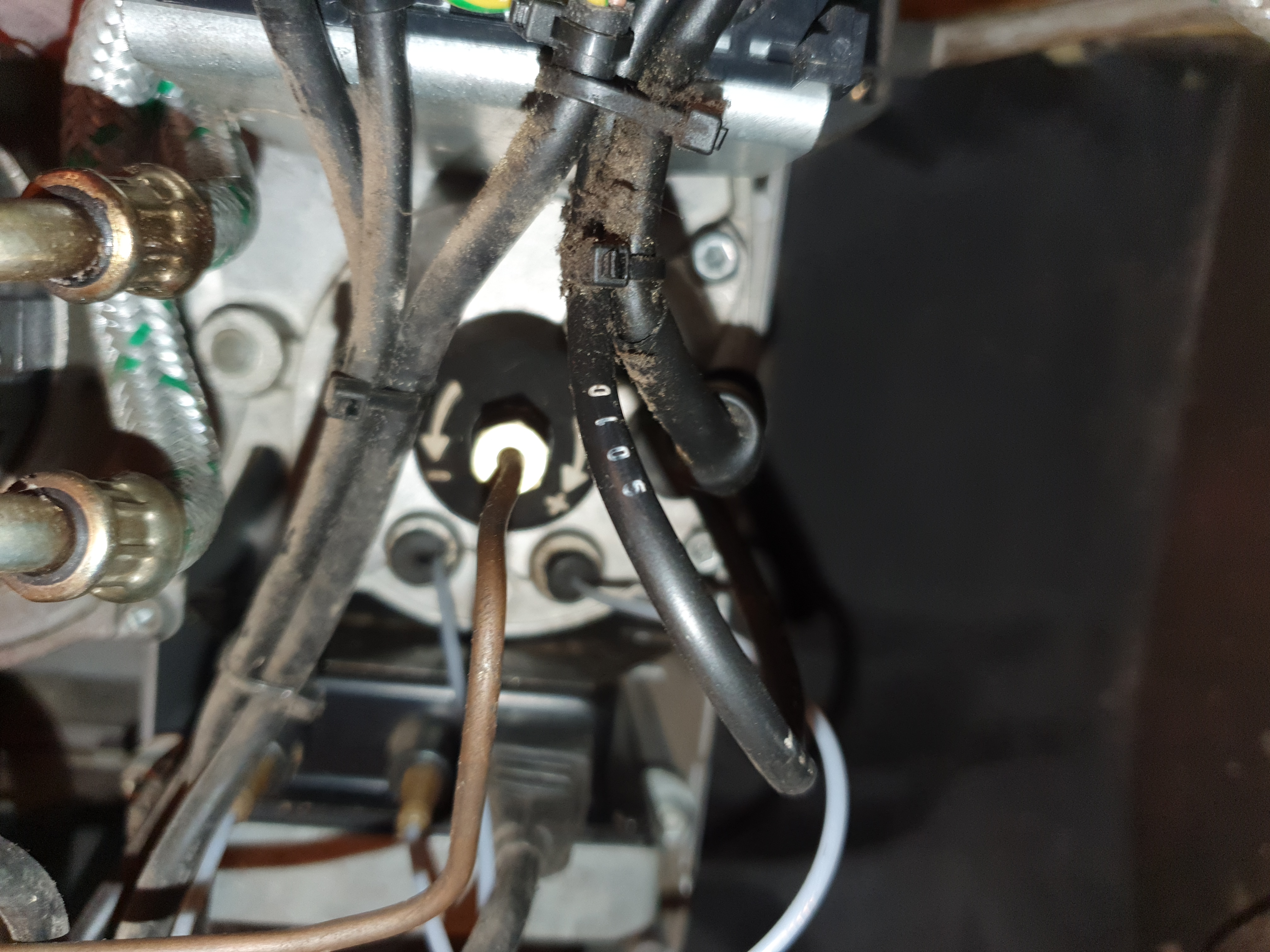 Ich muß mich korrigerien. Die beiden losen Drähte (brau und schwarz) gehören nicht zu dem bedruckten Kabel, sondern das dickere. Habe das in der Hitze des Gefechtes vewechselt. Der Brennraum / die Düse sind trocken.