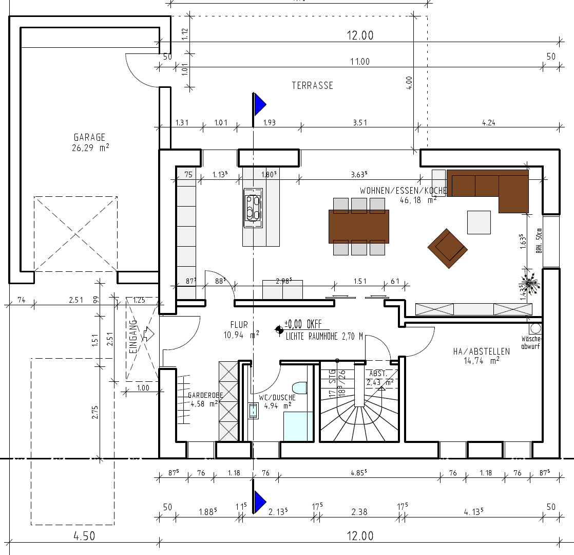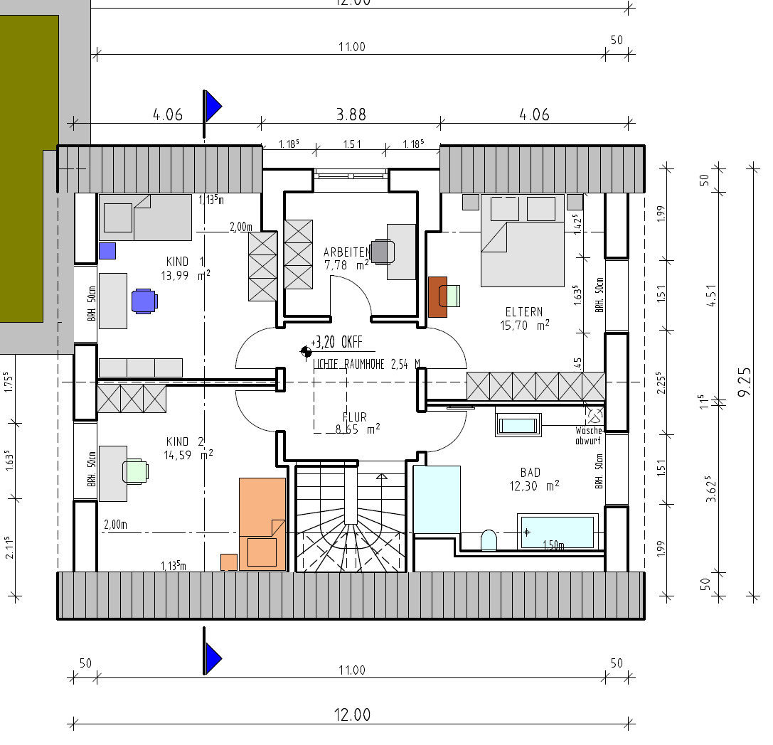 Ich würde den Wäscheabwurfschacht etwas größer planen, und daneben (oder integriert) gleich die Abluft nach oben ins Bad legen u. auch eine 150er Zuluft ins Wohnzimmer, die man mit Elektroklappe in der Nacht absperren kann, um die Lebensdauer der Filter und Ventilatoren zu verlängern, da nur Zuluft in die Schlafräume notwendig ist... Wenn man im EG die Abluft via 150er Rohr z.B. oberhalb der Küchenschränke macht (kann man gut verstecken), kann man sich auch den Schalldämpfer sparen (Bad u. WC sind unkritisch bzgl. Lautstärke).